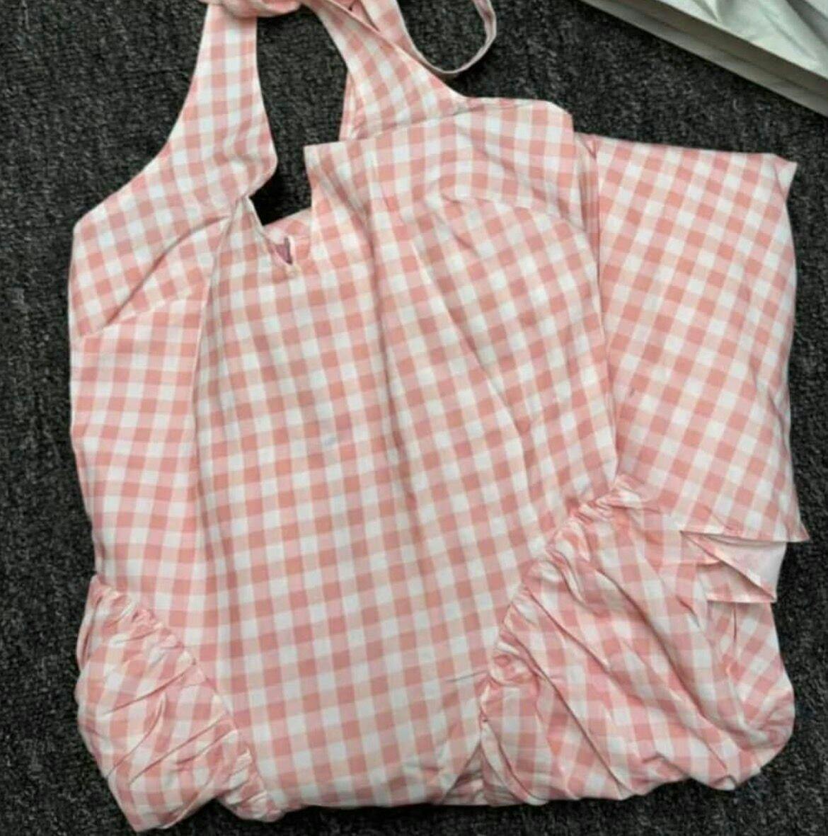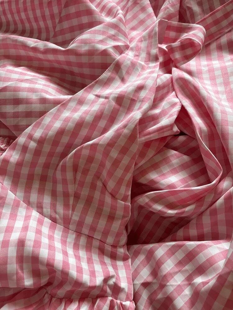 Color: Baby pink with gingham checks, radiating freshness and romance