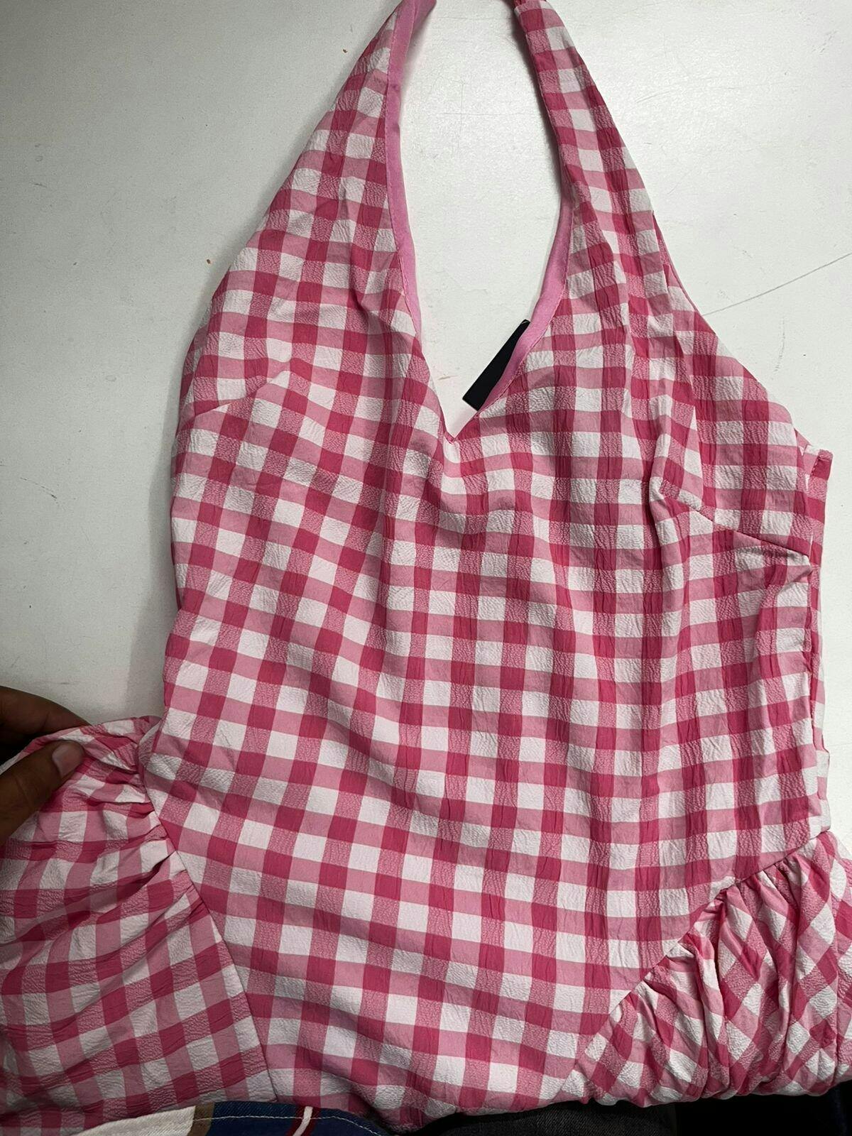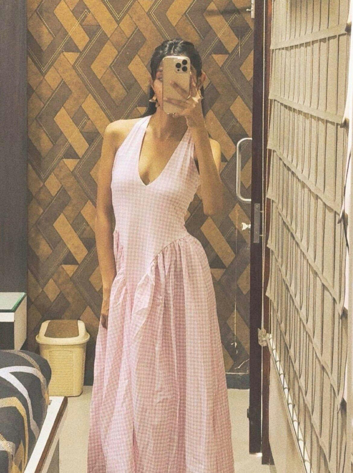 A halter midi dress in soft baby pink gingham, combining playful charm with graceful femininity for an effortlessly elegant look.